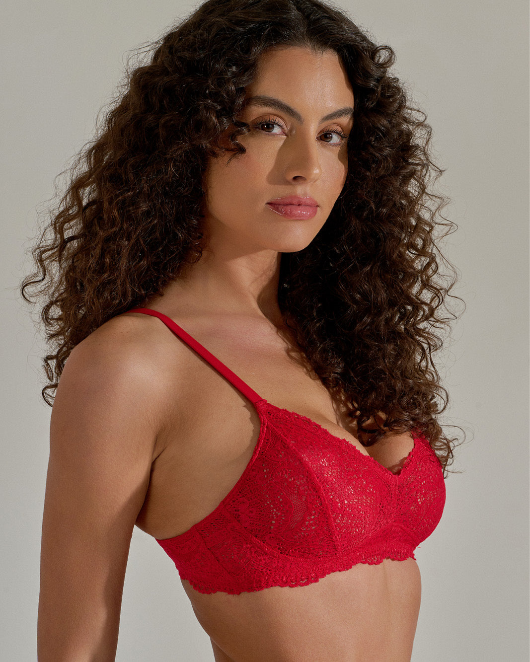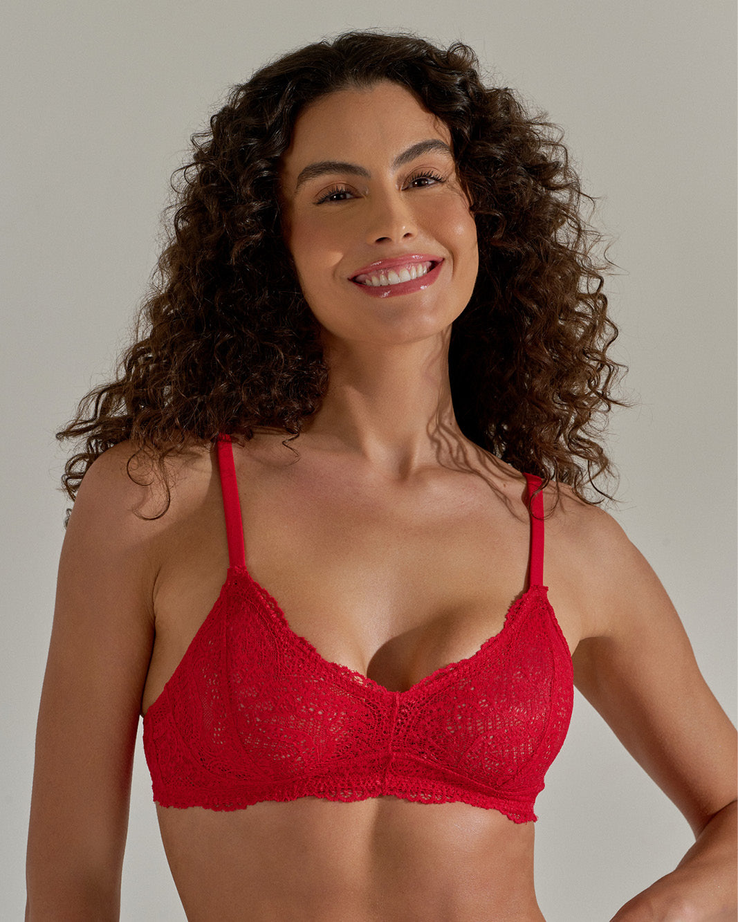 Sutiã rendado sem bojo, com alças encapadas, finas e reguláveis, não possui aro.